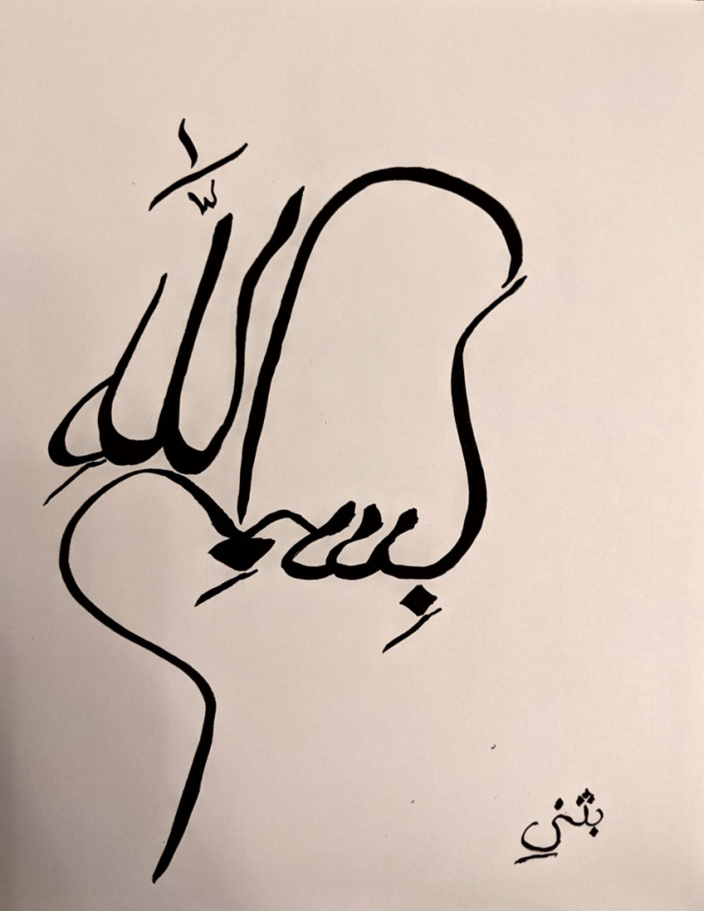 Lastly, I tried calligraphy. In the last step, the module invites you to try calligraphy yourself. I knew mine was going to be amateurish, as it is my first time, but I tried it anyways. I wrote “bismillah” and then signed it in Arabic. It was challenging because when you watch calligraphers, they make lines and letters in one-fell swoop, but I could not do this. I tried, but I was not confident enough and I made lines too thick in some places and made some lines that have ink out of place. Instantly though, I felt that feeling of “harmony between control and freedom”. No two pieces of hand-drawn calligraphy will ever be identical. In this way, calligraphy is free and unmeasurable. It does not matter if the tooth of a ‘ba’ is as long as an alif or if the phrase is read from the bottom to the top, it is free and will not be compared to another piece of calligraphy because of a technicality. Calligraphy is not ruled by precision, yet it is not so free that it is abstract and untidy. Calligraphy is put within the constraints of words and in this way, it becomes the oxymoron of control and freedom. One can twist and elongate or shorten and bend; one can even mix up the order of the words, but they are still that: words. And there is something calming about this. Not to mention, its beauty lies in its uniqueness, its imperfections. It is not defined by details, yet its beauty exists in them. Its imperfections literally make it beautiful.