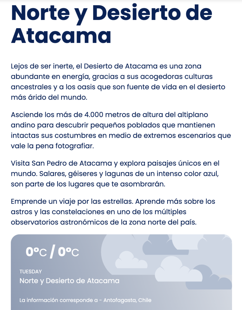Chile Travel. (2021, August 25). Norte y Desierto de Atacama. https://www.chile.travel/donde-ir/macrozona/norte-y-desierto-de-atacama/